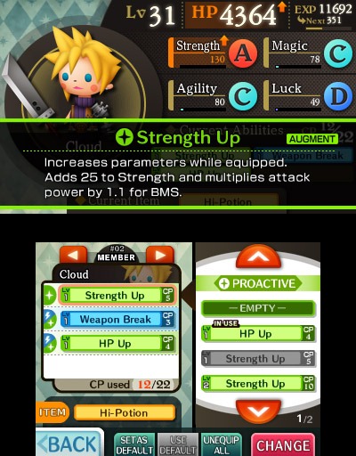 After you complete a series you can play those three songs in challenge mode where there’s an expert level for each track with more notes to hit. Even though this game uses the Final Fantasy name, there isn’t much of an overarching story. Rhythm exists between Chaos and Cosmos, the gods from the Dissidia games, and you can restore the music crystal’s luster by collecting Rhythmia. Also inspired by the Dissidia series, you get bonuses for playing Theatrhythm everyday and picking say Tidus for Final Fantasy X songs. While there is a sizable selection of Final Fantasy characters to add to your party (like Princess Sarah from Final Fantasy I), you’re better off sticking to one group unless you want to level up each hero from scratch.