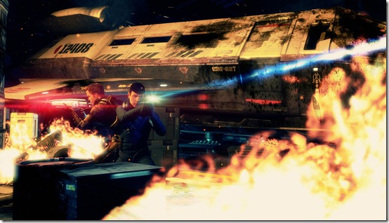 Kirk is paralyzed during the enemy encounter and Spock picks up him off the ground. The two head to Med Bay, but only the player controlling Spock can move. Since he’s carrying Kirk, its up to the player controlling Kirk to fire his phaser and protect both players. Inside Med Bay, Spock uses a medical laser to restore Kirk. The difficulty of this sequence depends on how many red shirts and data you scanned with the tricorder earlier. Meanwhile, Kirk (and the player controlling him) must continue to blast enemies to cover both characters. Star Trek shows each character different cutscenes, as well. When Spock and Kirk roll into cover after an enemy ambush, the event is told from the perspective of the character you’re playing.