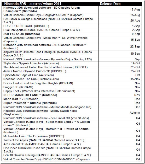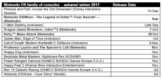 Nintendo of Europe just shot out a release list for the remainder of the year. Note that the list isn’t exhaustive and appears to be missing games like Harvest Moon: Grand Bazaar and Rune Factory 3, which were due out in September, last we heard.
