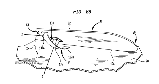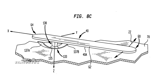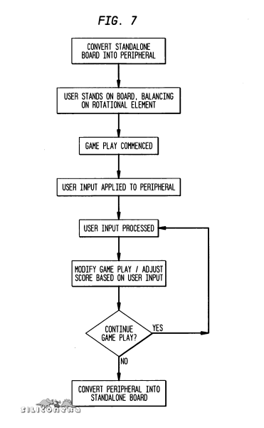 The patent application also lists other ideas like mounting a detachable skateboard, complete with wheels, to the base. After being used for the game, players can unscrew the board and use it in a real life halfpipe (fig. 7). Another idea was to put a reflective tracking ball on top of the board, which a camera can detect and process for game use.