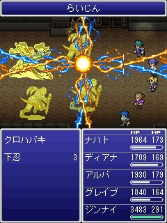 The story in Final Fantasy Legends: Warriors of Light and Darkness is told in separate downloadable chapters. Just like Final Fantasy IV: The After Years this is also a mobile phone game. Each chapter adds a new job class. Jinnai’s chapter adds ninja, which apparently have a thunder attack called Raijin.