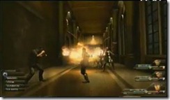Bits of gameplay showed Noctis running away from an exploding building. There were no transitions into fights. Noctis ran into armored soldiers and attacked them with two other characters. It appears players can switch characters in Final Fantasy Versus XIII. During battles, the trailer showed glimpses of magic like a lightning spell and a fire attack.