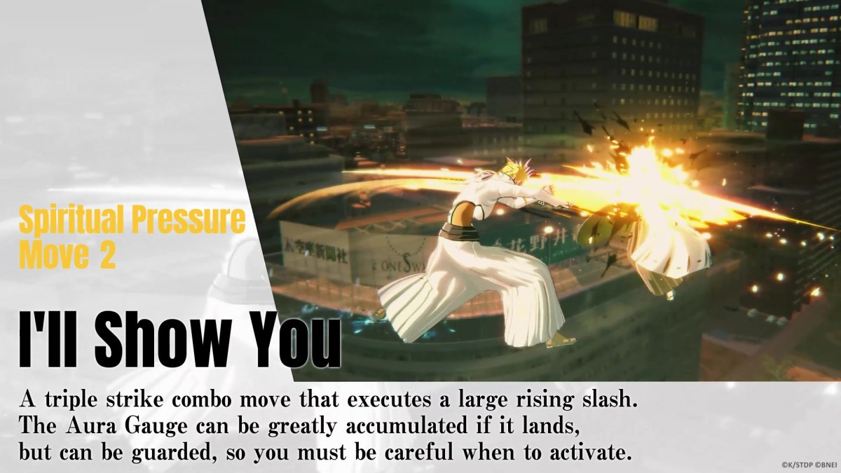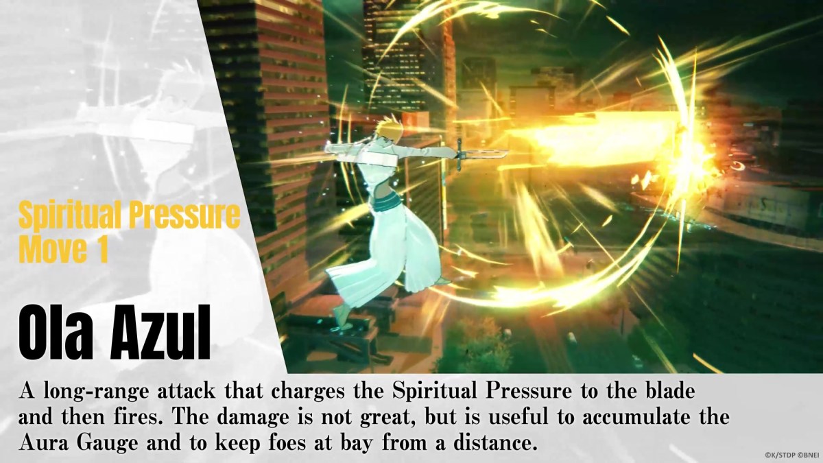 Tier is historically one of the more powerful Arrancar in the series. She’s the Tres Espada as we head into the Hueco Mundo arc of the manga and anime. She’s known for her quick combos, and her Aura Gauge rewards players for performing them. If you keep up the assault, it will fill and increase her attack. She also has an Ola Azul Spiritual Pressure ranged attack to help maintain that type of barrage of hits. She also has a closer range I’ll Show You Spiritual Pressure move that hits three times to build up a combo.