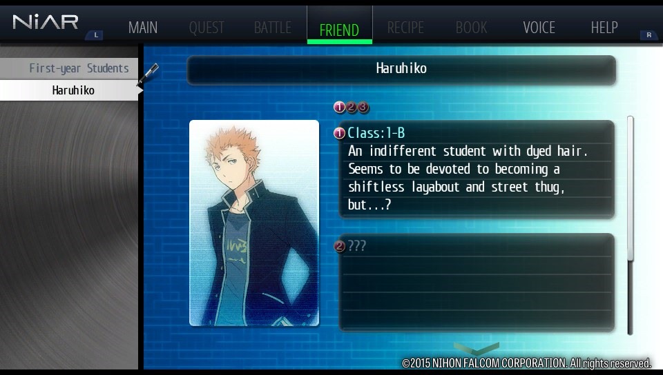 There’s also the whole personal stat system. While Persona has five attributes to boost, Kou has three: courage, virtue, and wisdom. You become more courageous by getting high clear ranks in dungeons. Virtue is boosted by taking NiAR quests from your phone and completing them. You become wiser when you make good decisions in the storyline or read books from Books Orion. It feels a bit more practical here, since there are actual stat-benefits from dungeon-crawling and quest completion, especially since Kou’s grandfather, Sousuke, will give him rewards for ranking up these attributes.