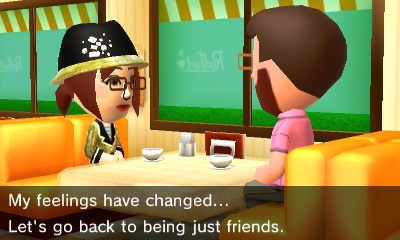 So, I did the responsible thing. I made my Mii break up with Chris’ Mii. Naturally, when something traumatic happens to a Mii in Tomodachi Life, they get upset. If they’re in a fight with another Mii, they’ll have a firey red aura around them, and be stomping around their apartment. The only way to cool the situation is to have a third Mii act as a mediator and hope the situation is resolved when the three talk it out. If a Mii is suffering from a broken heart, their level bar is filled with blue sadness, and a raincloud appears over their head. They must be plied with food and gifts to get them back to their normal demeanor. The breakup was hard on both Chris’ Mii and my own. I tended to my own first, because nepotism. She was a little sad, with her level bar half filled with the terrible blues, but it was easy enough to cheer her up. Some pancakes, a new outfit, and a headrub later, she was back to her normal self. Little Chris, on the other hand, had decided to be sad forever.