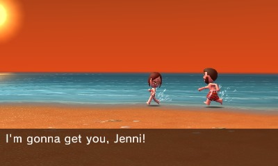 I felt so bad. Really, seriously, so bad. Nothing helped! I fed him. I patted his head. Gave him a bath. Offered him clothes. But he just wasn’t getting happy again. So, I clicked the bubble with my face on it that was appearing onscreen. I figured maybe it would make him try and get back together with my Mii, because I was honestly feeling guilty about what I’d done. No. What followed was an adorably touching montage of all the memories Chris’ mini Mii and my mini Mii had accumulated during the 15 minutes they were a couple. It was heartbreaking, because it actually followed the natural progression of a relationship as it died. There were event scenes where they were happily running on beaches and laughing at each other’s jokes. But slowly, they grew apart. To quote the great Linda Richman, “I’m a little verklempt.” Just look at a few of these screenshots while I compose myself.