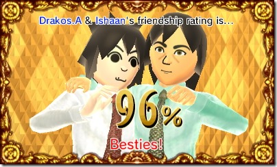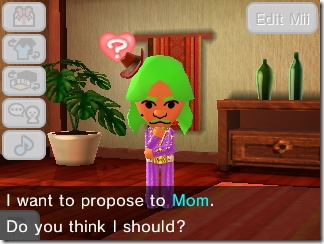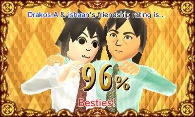 Once the wedding is over, the couple settles down together in Mii Homes. It’s a plot of land near Town Hall with a bunch of homes for new families. The Miis will still visit their old apartments from time to time, but their new base of operations is a quaint island cottage. Truth be told, I often felt bad interupting the newlywed’s married lives, because they seemed to be so happy and wrapped up in each other. They also seemed to need regular attention less often, but perhaps that’s just today has been such a big day for both new families. There weren’t the only social developments in Tomodachi Life. The biggest development is that Shigeru Miyamoto finally settled down. I think it had something to do with the compatibility percentages, as he decided on a Mii named Mandi. (They had a 98% match!)