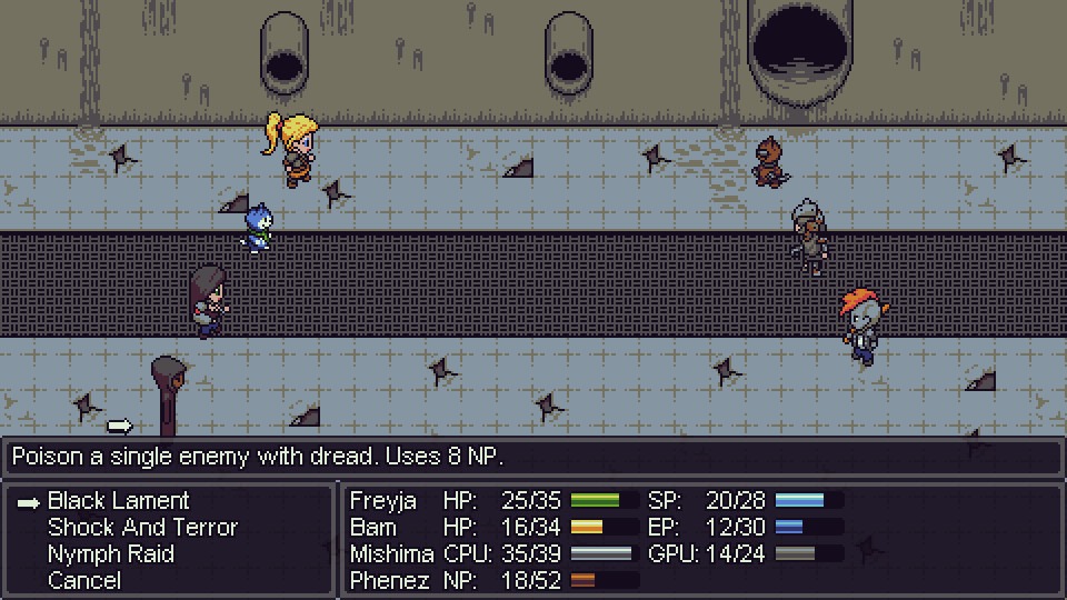 The Sworn Light have been growing in power while the felines, humans, electropunks, and ghosts bicker amongst themselves. It’s at this time that Freyja was dispatched to take them out, finding a group of warriors from each group that can help her on her quest to turn back this evil power. Each of these characters will have their own unique powers to use in a fight, so each will make a big difference in the game’s turn-based combat. They also have abilities that will let players traverse the overworld as well, so having a solid group of friends is key throughout the game.
