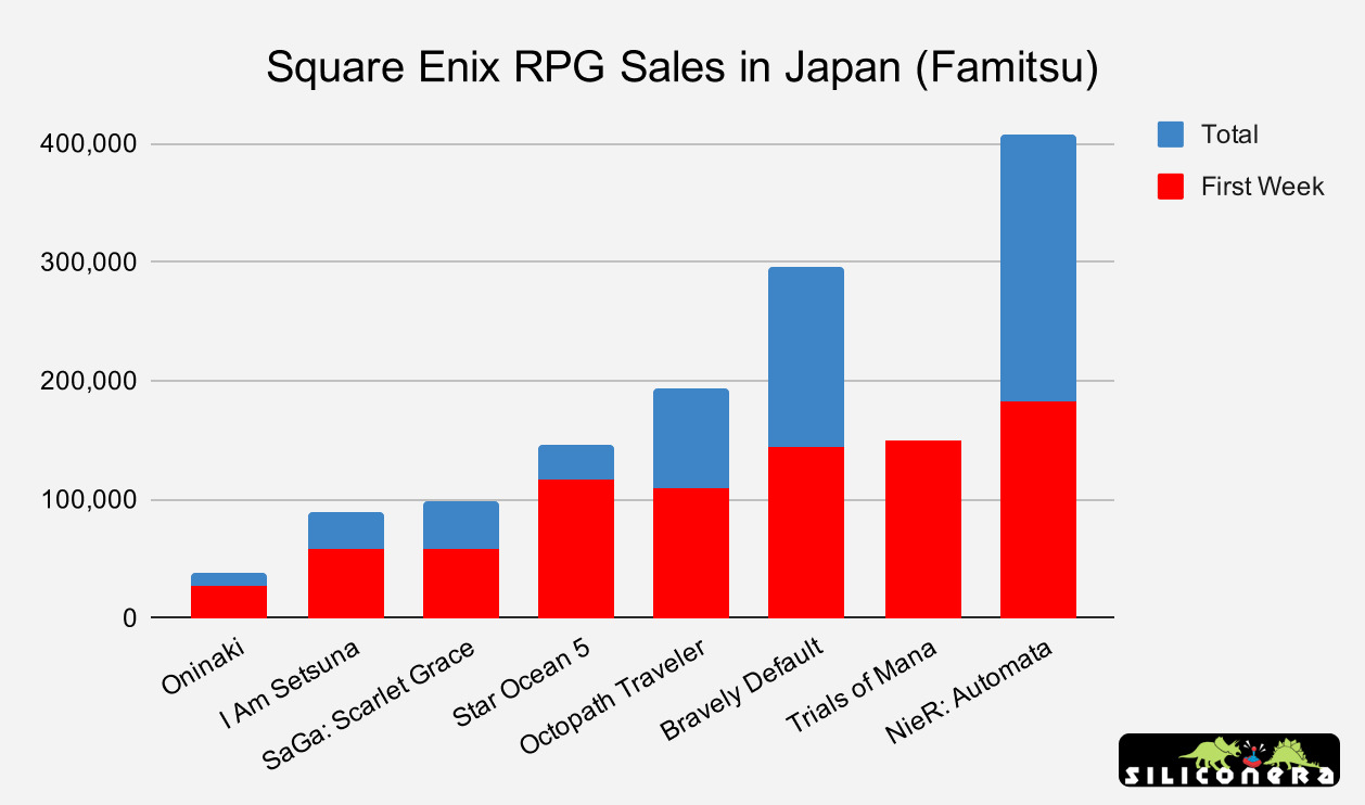 As the chart above illustrates, Trials of Mana managed to match or beat the first week sales of just about every other Mana game released over the last 17 years. That isn’t saying much, given that most of those games were cheaper to develop (or poorly made), but it is a start. Next is a look at how Trials of Mana compares to other notable mid-budget RPGs Square Enix has released over the last few years.