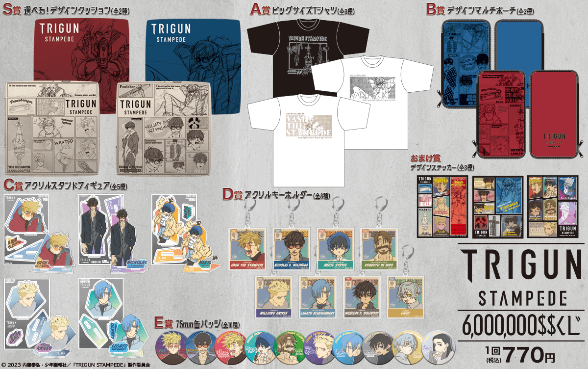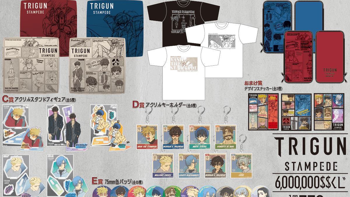New Trigun Stampede merchandise will appear as part of an online kuji (lottery) in Japan. The items in the lineup include cushions, t-shirts, pouches, acrylic stands, keychains, and pin badges. Tickets for the lottery cost 770 JPY each (or approximately $5 USD) and will be available for purchase from July 20, 2023. The lineup of goods is divided in six different tiers going from S to E, with prizes varying between tiers. [Thanks, Dengeki Hobby!] You can take a better look at the full lineup of the merchandise for Trigun Stampede kuji here: