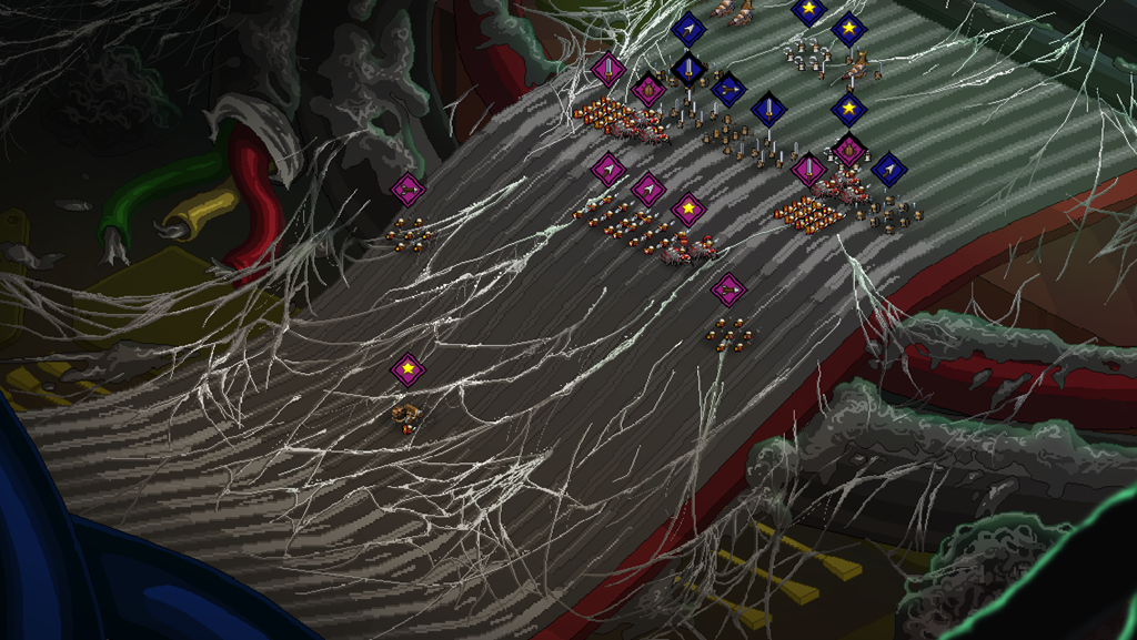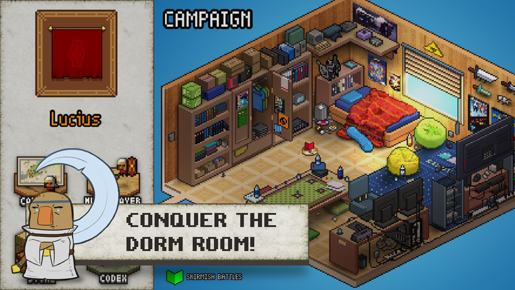 What started as a serious wargame more in line with Witching Hour’s Ravenmark series morphed along the way into a pixel-art based comedy, though everything under the hood is still rooted in turn-based standards. Except instead of rocks, catapults fling poop and cavalry ride spiders into battle. Since you’re in a dorm room, terrain backdrops include Dungeons & Dragons figurine deities, backdrops of unidentified food crusts, four-sided dice mountains and more.