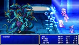 There isn’t much of story to Final Fantasy compared to the later games in the series. You have four light warriors who that carry magic crystals (not orbs like in the NES version) and remain silent throughout the game. Their journey begins by saving Princess Sara of Coneria from Garland, a master swordsman. It’s a cliché start, but Final Fantasy broke the mold of other RPGs during its time because you rescue the princess in the first thirty minutes of the game. The plot unravels into a quest to save the world and battling four elemental fiends to stop a time paradox. The twists in Final Fantasy were remarkable when it first came out, but today they may not impress fans that started out with the emotionally charged stories the Final Fantasy series is known for.