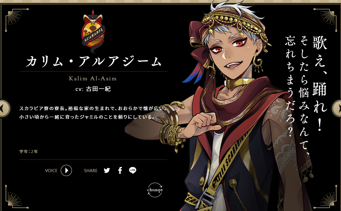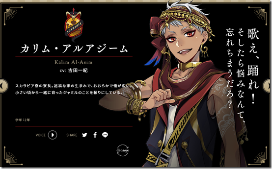 A teacher at Night Raven College, who manages science-based subjects like potion making. He sometimes becomes overly obsessed with fashion. Scarabia (Twisted from Aladdin) Kalim Al-Asim (CV: Kazuki Furuta)