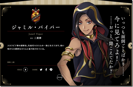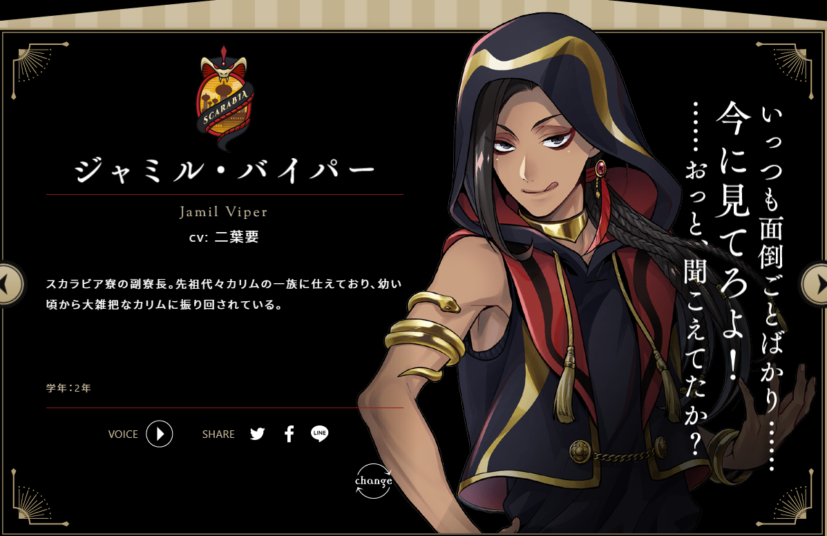 “Now sing and dance! Then you’ll forget all about your worries, right?” The head of the Scarabia house. Born in a rich family, he’s always smiling and is quite open-minded. He relies a lot on Jamil, who was raised alongside him from a young age. Jamil Viper (CV: Kaname Futaba)
