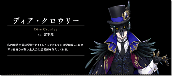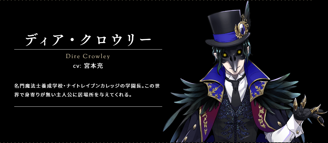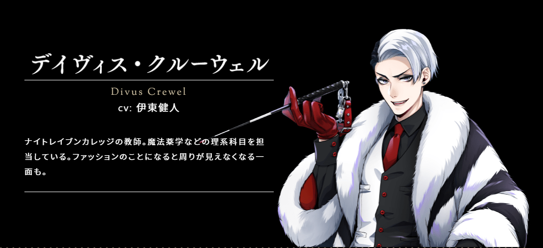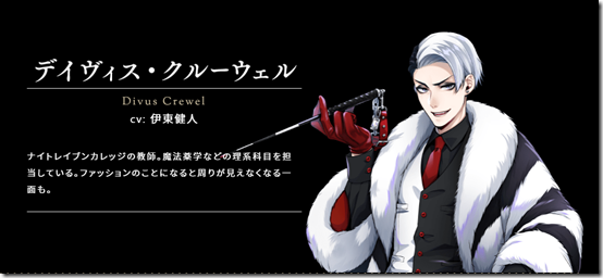 The headmaster of Night Raven College. He gives a place to stay to the protagonist, who has wandered in from a different world. Divus Crewel (CV: Kento Itou)