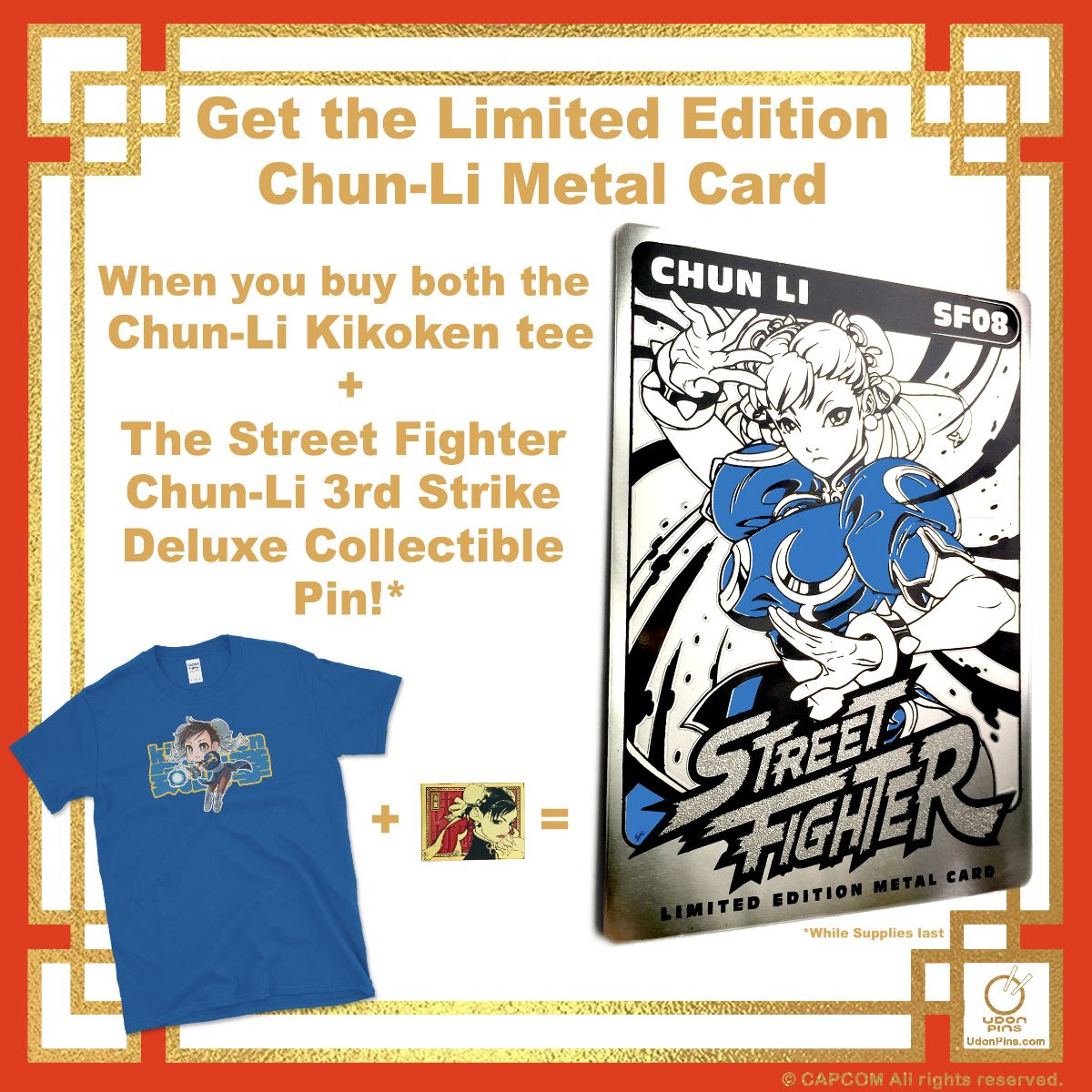 The Street Fighter Chun-Li 3rd Strike pin is immediately available. Udon’s Chun-Li shirts will ship out in April 2021. If someone buys both a pin and shirt, in order to get the metal card, then you might have to wait until the shirt is ready for the pin to also ship.