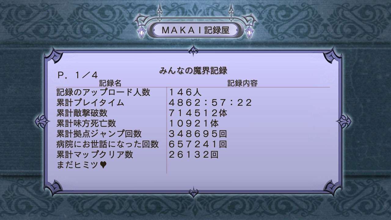 Those aren’t the only stats Disgaea 4 keeps track of. The game records your playtime (up to thousands of hours), total level, maximum damage, the number of enemies defeated, and so forth at the data record shop.