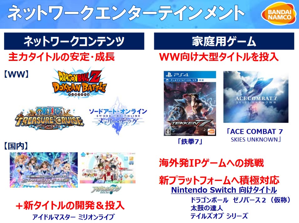 The above is basically a look at what Bandai Namco has planned out for 2017’s network entertainment. Under “network contents” it shows their plans to continue maintaining and expanding smartphone titles on a worldwide scale with Dragon Ball Z Dokkan Battle, One Piece Treasure Cruise, and Sword Art Online: Memory Defrag. Under console games, it shows their plans for two major worldwide console releases with Tekken 7 and Ace Combat 7. It also says they’re looking to take on the challenge of making a game from an overseas IP. And finally, the last part shows plans for releasing games on a new platform, the Nintendo Switch. It has Dragon Ball Xenoverse 2 and Taiko no Tatsujin, but we’ve already known that they’re getting new Switch games in 2017. The new part here is where it’s listed as “Tales of series” beneath the two for Switch in 2017. However, a Tales of has been listed as “TBD” since January when Nintendo shared some of the upcoming games and series that are expected to release titles for their new consoles. That said, with a 2017 release window for a new Tales of game, we can expect to see some kind of Switch port given that they won’t likely reveal a brand new Mothership title later and have it ready on time for a release within the year. Perhaps we’ll hear about a Tales of Berseria Switch version at Tales of Festival 2017, which takes place from June 2 through 4 in Japan.