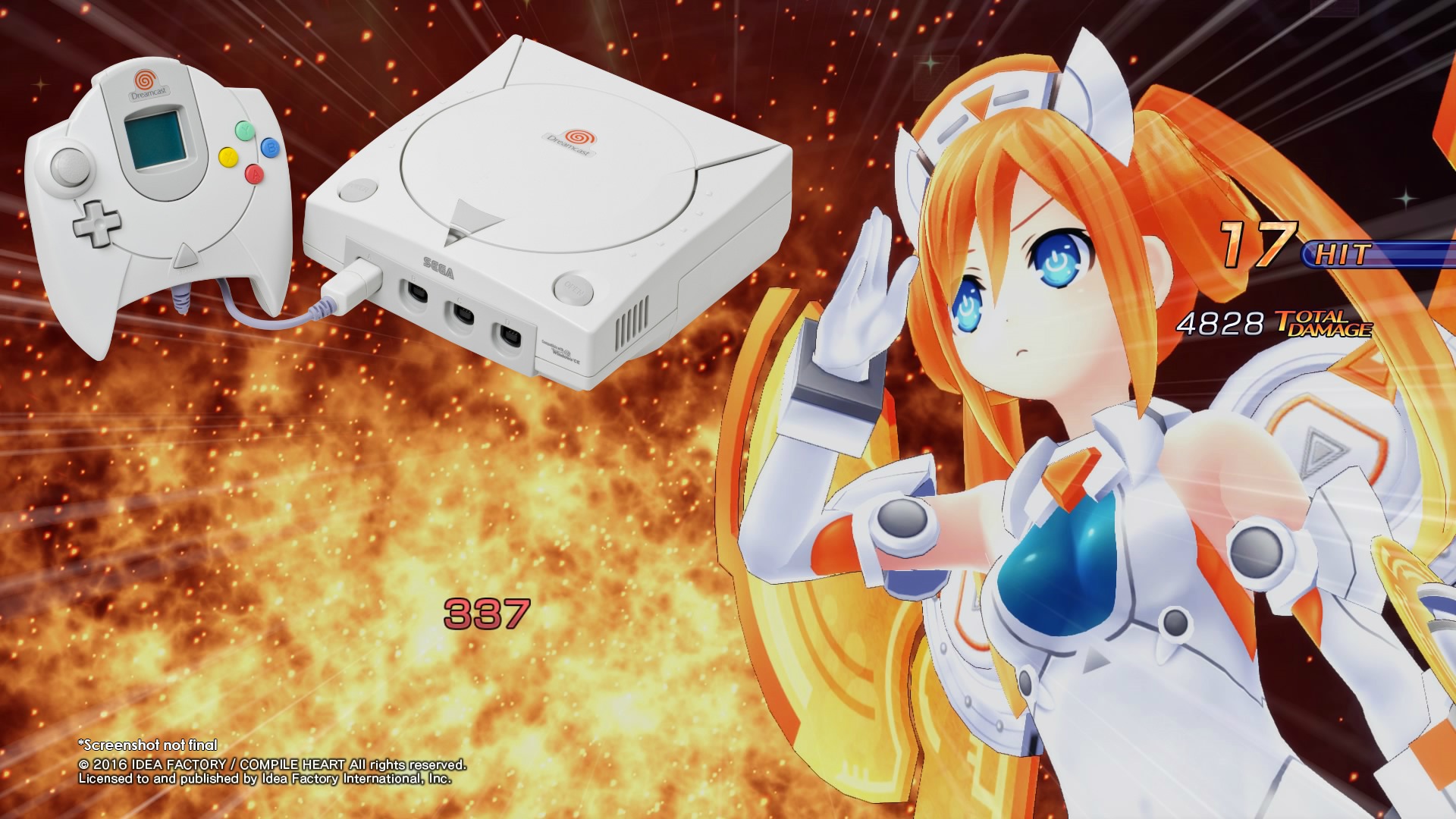 Though the absolute best shout out comes when Orange Heart is near death in a battle. If you complete it with her doing the last hit, so you’ll see her victory pose when the battle is done, both her her eyes will be spirals. Where have we seen those spirals before? Oh, right, on the top of the Dreamcast.