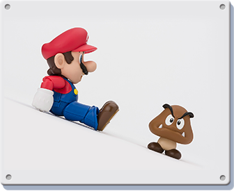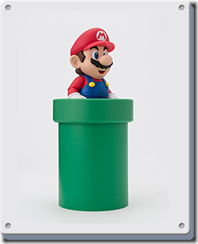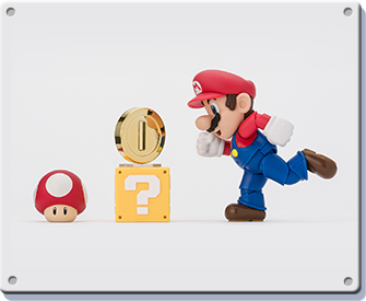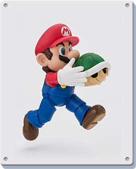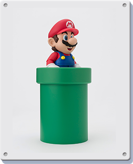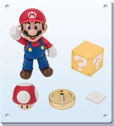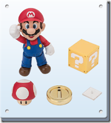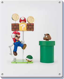 The figure stands at 100mm tall and is made of ABS and PVC. The main set comes with Mario, a Question block and gold coin as well as a Super Mushroom. You can also pick up two more sets which add more interaction-bits for the Italian—a block set that adds two brick blocks, another Question block and gold coin, a Goomba to stomp on and a base plate with extra standee to help pose Mario mid-jump. The pipe set adds two pipes of different heights, another Koopa, a green shell, swappable hands to let him hold the shell and a third gold coin.