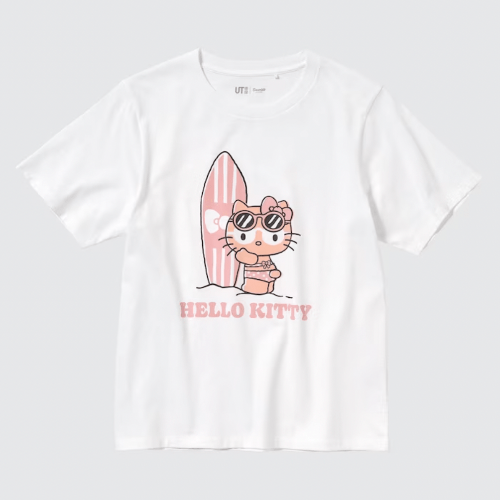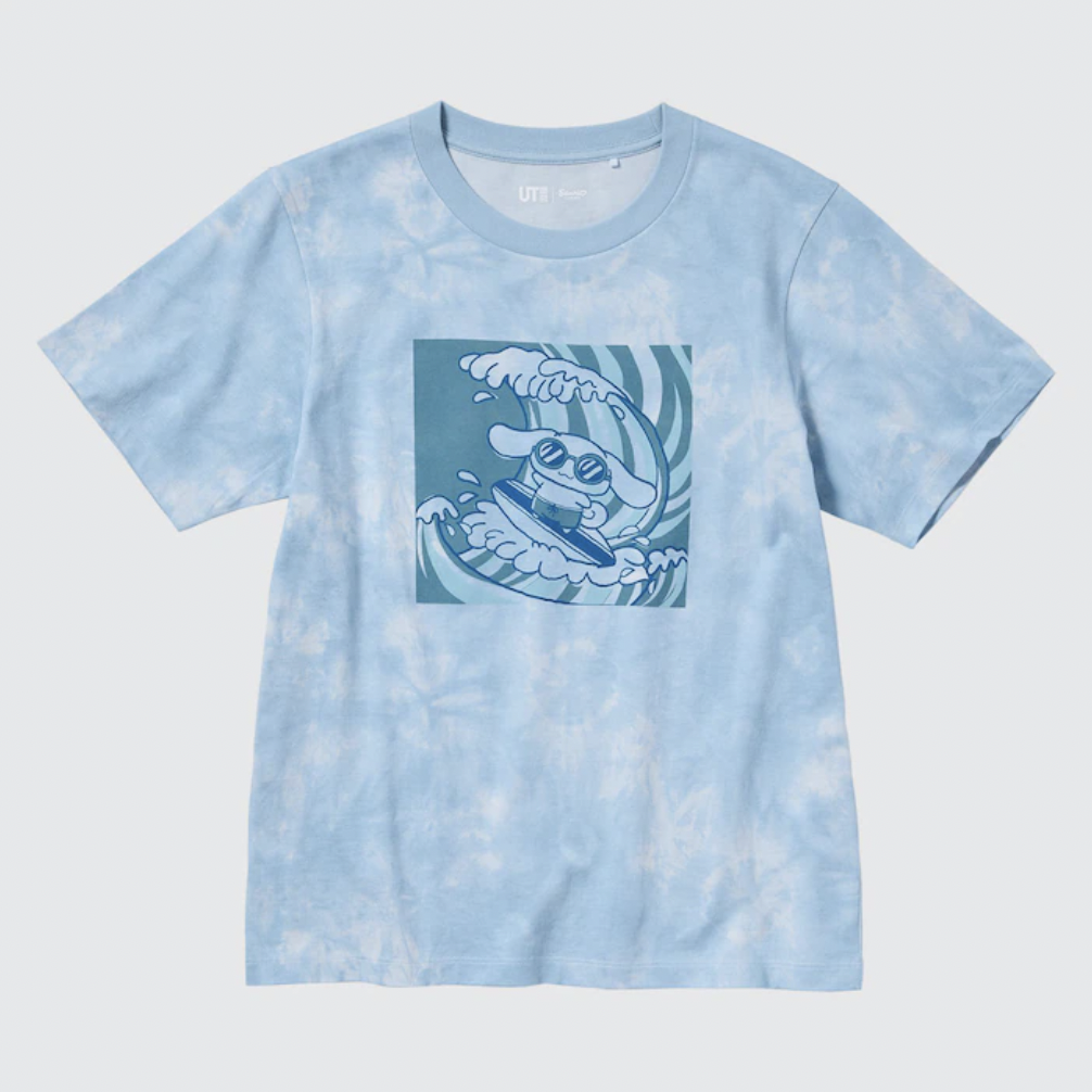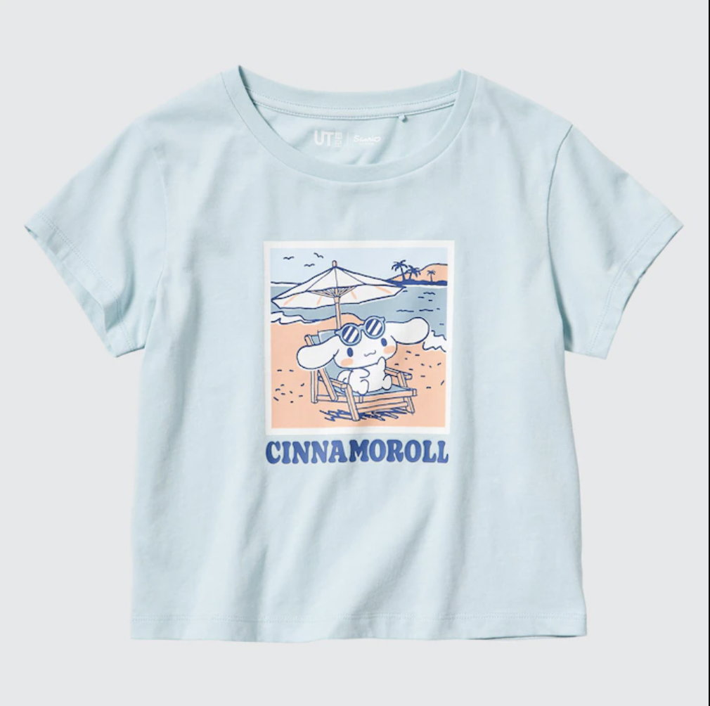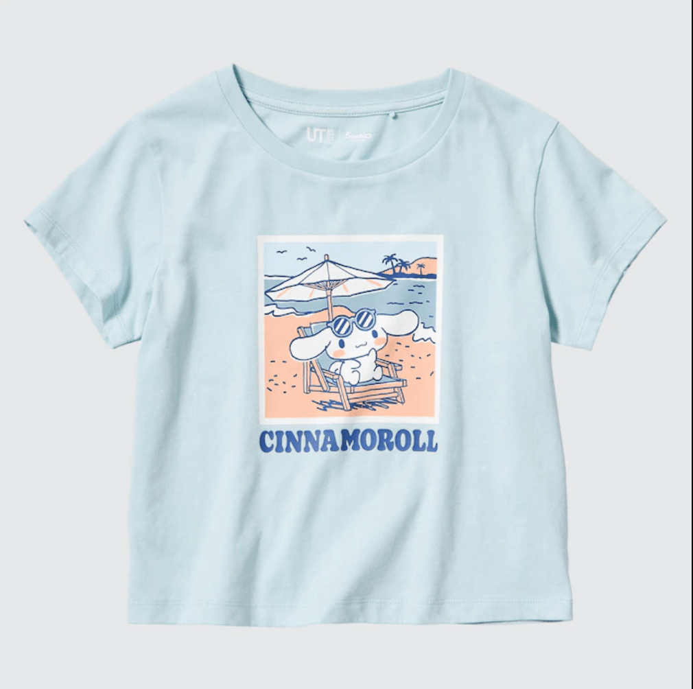 Uniqlo started selling its new Sanrio Characters Beach Trip shirts. This collection features five designs for women and five for children. All of them feature Hello Kitty, My Melody, Kuromi, Cinnamoroll, Gudetama, and Pom Pom Purin engaging in beach activities. People can immediately find it both in retail stores and on the official website. All of the women’s Sanrio Characters Beach Trip are $24.90 each at Uniqlo. They are available in sizes XXS through XXL. That line includes designs with My Melody and Kuromi in intertubes, Cinnamoroll surfing, My Melody with a beach umbrella, a sunburned Hello Kitty with a surfboard, and Gudetama hula dancing.