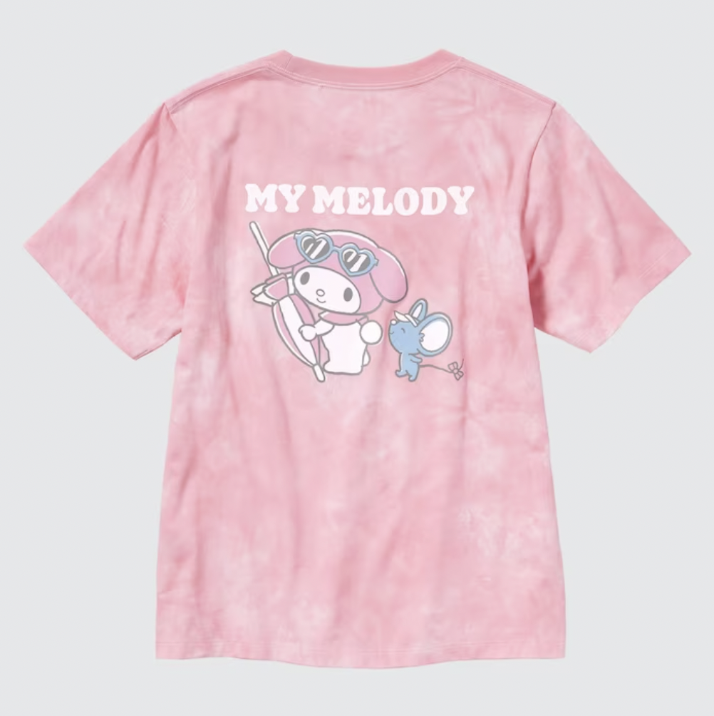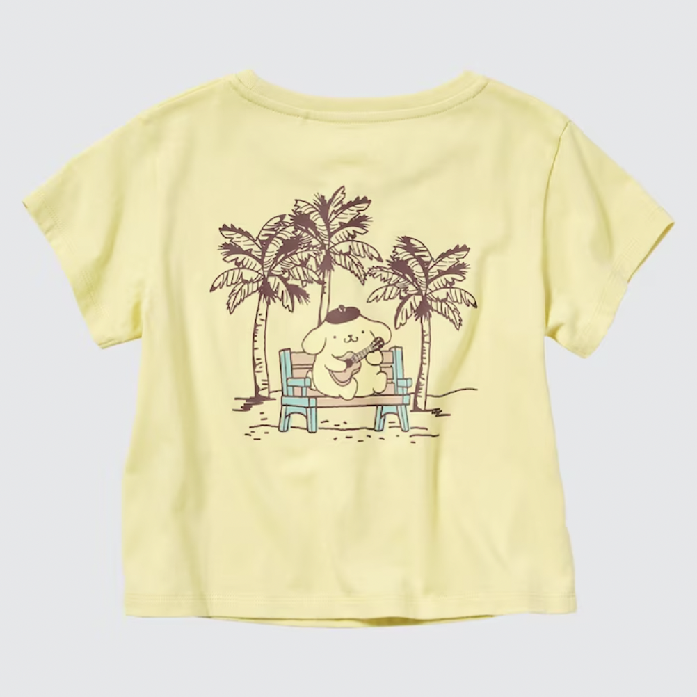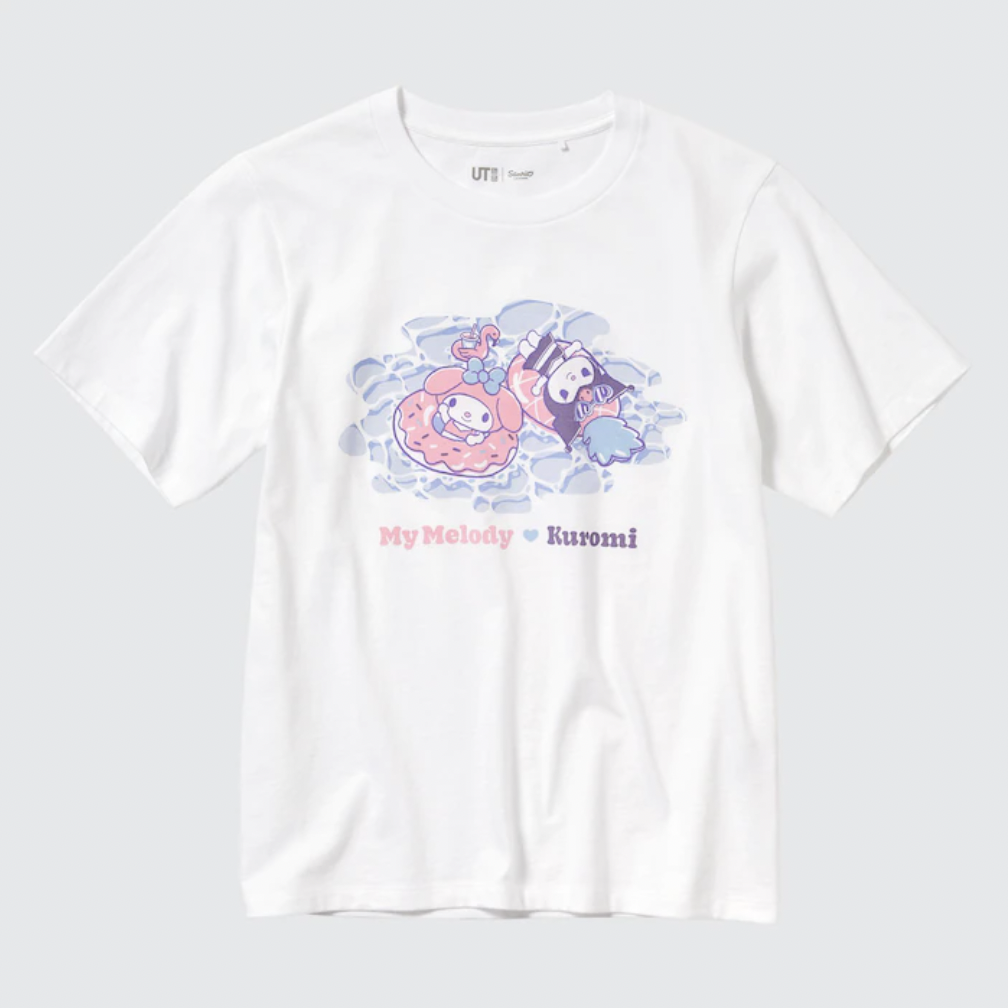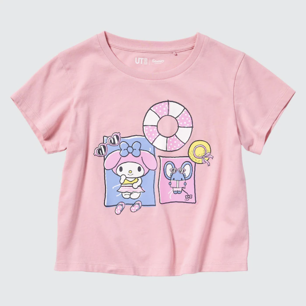 Uniqlo started selling its new Sanrio Characters Beach Trip shirts. This collection features five designs for women and five for children. All of them feature Hello Kitty, My Melody, Kuromi, Cinnamoroll, Gudetama, and Pom Pom Purin engaging in beach activities. People can immediately find it both in retail stores and on the official website. All of the women’s Sanrio Characters Beach Trip are $24.90 each at Uniqlo. They are available in sizes XXS through XXL. That line includes designs with My Melody and Kuromi in intertubes, Cinnamoroll surfing, My Melody with a beach umbrella, a sunburned Hello Kitty with a surfboard, and Gudetama hula dancing.