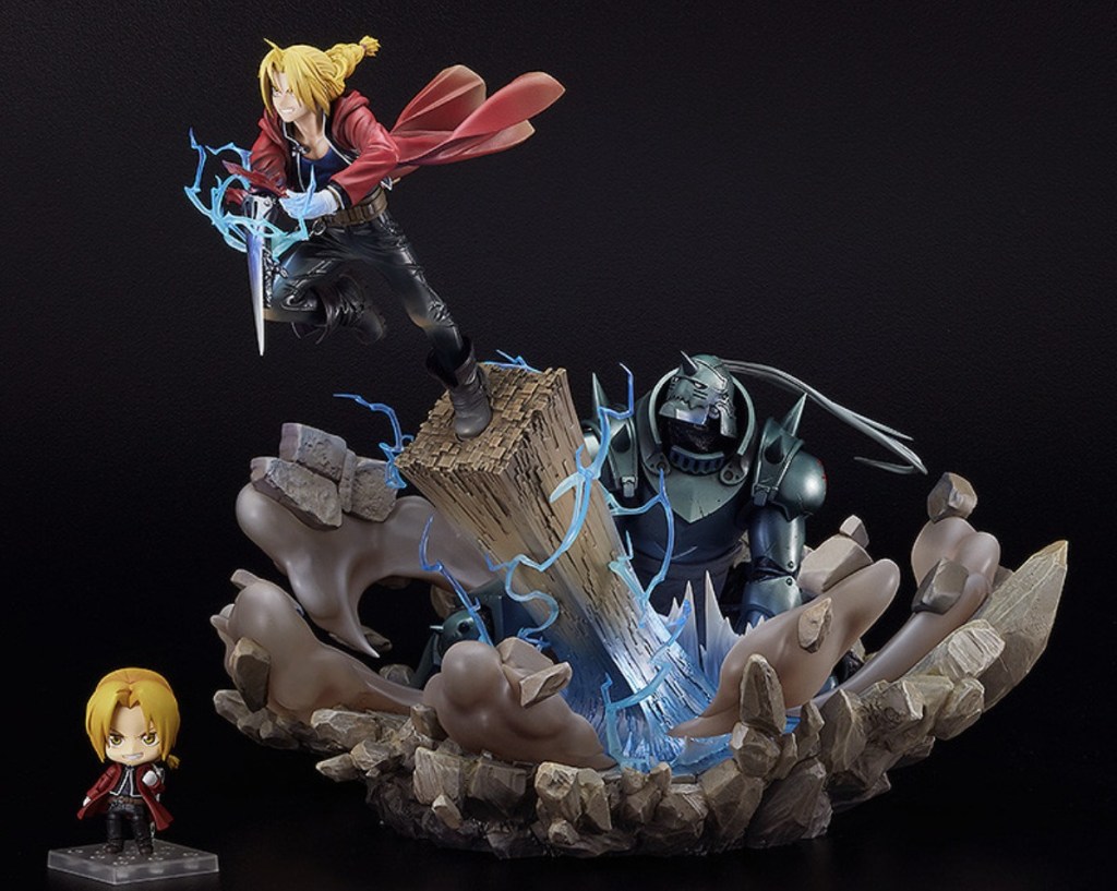 A new Fullmetal Alchemist Ed and Al figure is on the way, and it is both elaborate and expensive. Good Smile Company revealed a $2,199.99/¥220,000 figure of the Elric brothers. It is a non-scale figure based on their Fullmetal Alchemist: Brotherhood appearances. It is expected to appear first in Japan in July 2023. Then in September 2023, it will show up in North America. Pre-orders are open, but this is also a situation in which they are limited and could run out. The figure is designed to show both Ed and Al in the middle of a fight. Electricity surrounds them, there’s dust on the ground, and both characters are in an active pose. Ed is using the pillar Al is holding to prepare to leap and attack. Here’s a closer look at the figure from various angles.