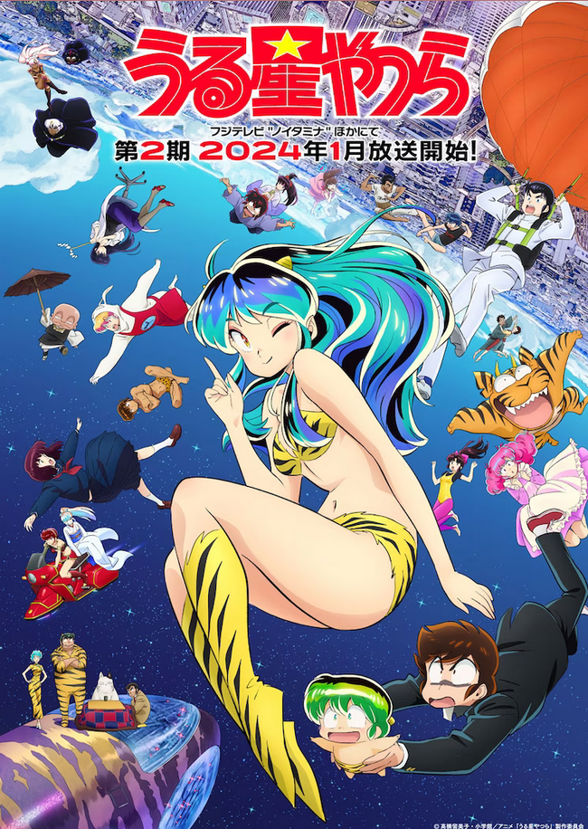 Season 2 of Urusei Yatsura will start airing in January 2024, and ahead of that a new key visual appeared on the internet. It features characters both new and old surrounding Lum, who is smiling and winking in the middle. There is no new trailer for the second season yet. [Thanks, Comic Natalie!]