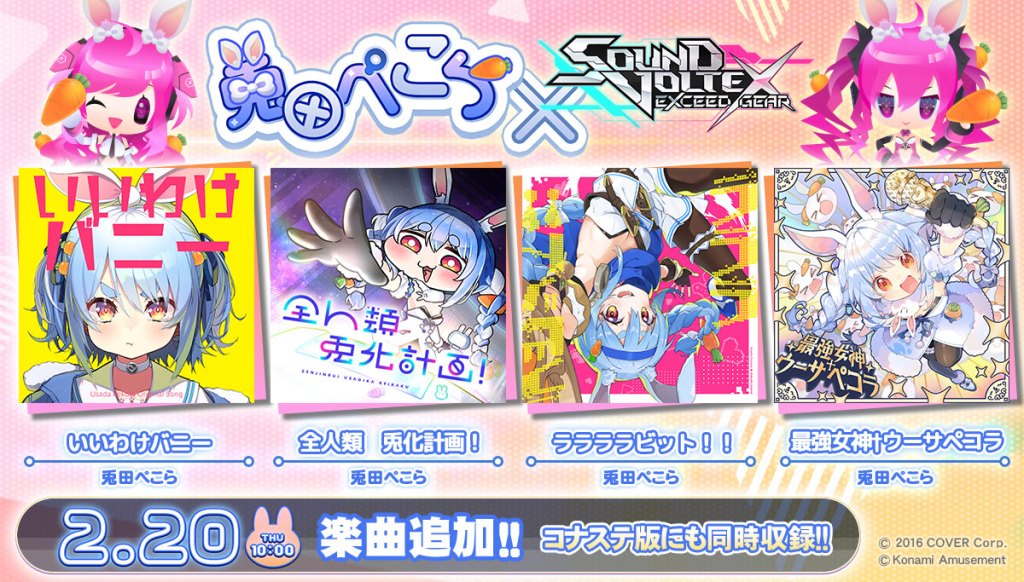 Konami has been gradually adding content based on Hololive Vtubers to its arcade rhythm game Sound Voltex, and one of the group’s most famous Vtubers is set to join the lineup. The company has announced that it will add new content based on Usada Pekora in Sound Voltex Exceed Gear on February 20, 2025.