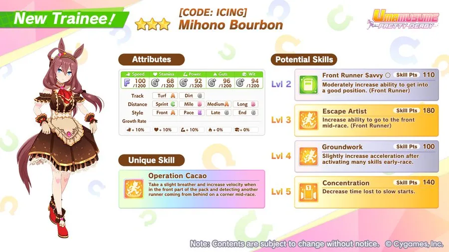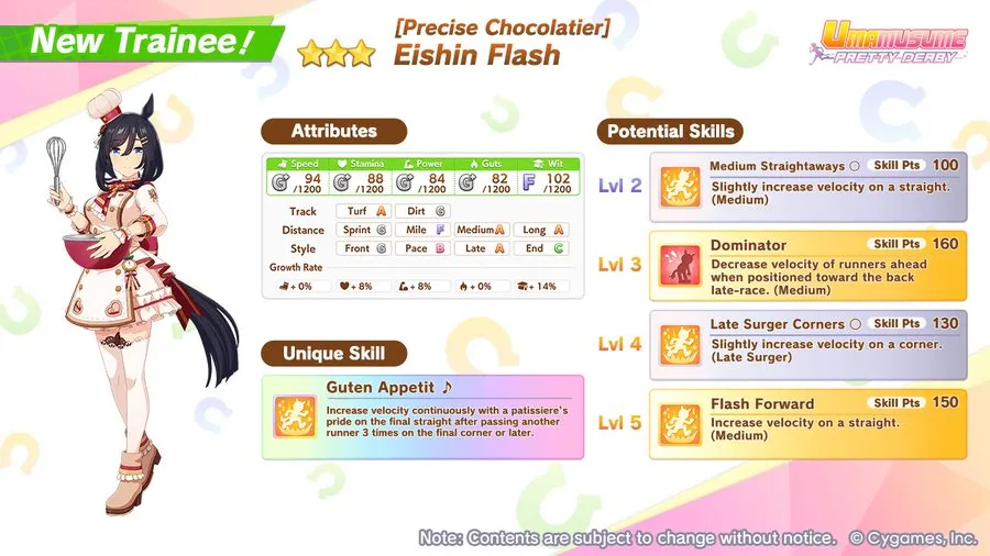 As is common with these three-star alts of Eishin Flash and Mihono Bourbon, they aren’t too different from their typical versions. The outfits, movesets, growth rates, and unique skills feature the biggest changes. Eishin Flash is still a Turf racer for Medium and Long races that is best as a Late Surger. Her new unique is Guten Appetit, to increase velocity, but you need to pass three times on the final corner or later to trigger it. She also has Late Surger Corners and Dominator as potential skills. Meanwhile, Mihono Bourbon is still a Front Runner for Turf Medium races, though it’d be easy to boost her potential for Sprint, Mile, and Long races as well due to them being at C or higher. Her Operation Cacao skill trigger is easily met, since she needs to be at the front and have another runner coming up behind on a corner mid-race. Her potential skills include Concentration, Escape Artist, and Front Runner Savvy.