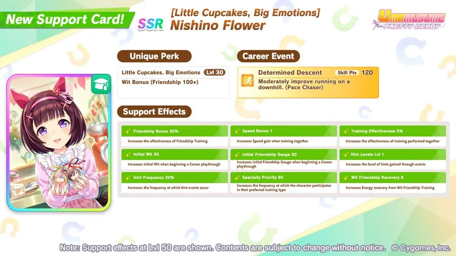 In terms of the new cards, the Sakura Bakushin O Guts card Super! Sonic! Flower Power! might offer more utility. That’s due to the Hint Frequency and Levels boosts and the fact she has the upgraded Sprint skill In High Spirits. The Wit Nishino Flower card Little Cupcakes, Big Emotions’ Determined Descent Pace Chaser skill is rather specialized, due to it only kicking in on downhills, even though she does have Specialty Priority, Hint Levels, and Hint Frequency effects.