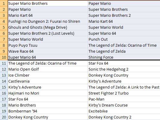 This is the top 20 list for Japan (left) and North America (right). It's not clear if these games are popular because they are the top selling Virtual Console games, most browsed games this month or most loved by the Nintendo staff (unlikely!). One thing that is odd is out of 40 games there is only a single TurboGrafx-16 game on the list, Bomberman '94. Poor TurboGrafix-16…