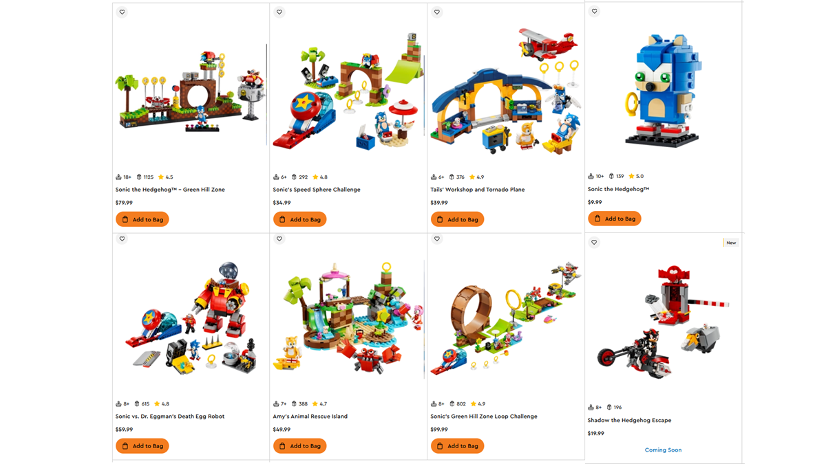 Example sets include Sonic the Hedgehog Green Hill Zone (21331, $79.99), Sonic vs. Dr. Eggman’s Death Egg Robot (76993, $59.99), and Amy’s Animal Rescue Island (76992, $49.99).