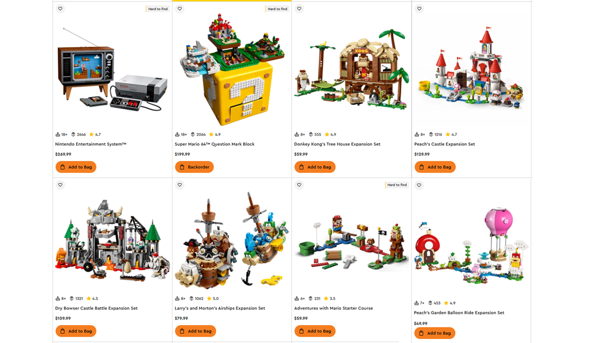 Sets include the Super Mario 64 Question Block (71395, $199.99), The Mighty Bowser (71411, $269.99), Peach’s Castle Expansion Set (71408, $129.99), and many others.