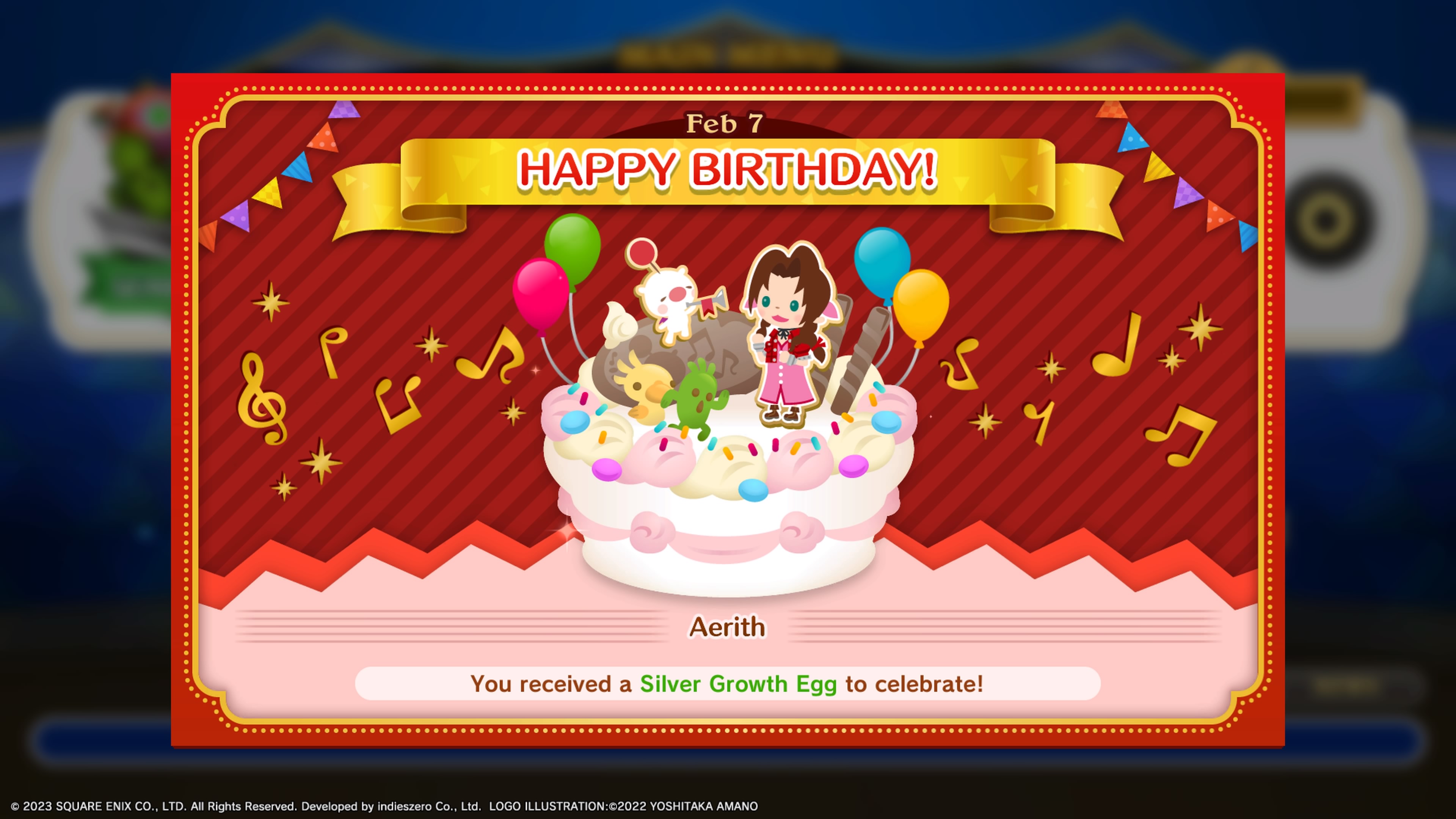 Theatrhythm Final Bar Line is a game to check in with when specific dates like birthdays roll around. The title celebrates Final Fantasy game anniversaries and character birthdays. People who stop by on those occasions get a reward that they can then use in-game. This is also marked by an image upon heading to the main menu that reminds you of what the special occasion is. Whether Theatrhythm Final Bar Line is celebrating a Final Fantasy character’s birthday or the day an installment released, you get the same gift and sort of notification. If it is a person’s birthday, you get to see their Theatrhythm character art perched on a birthday cake with a “Happy Birthday” banner. It then notes that is the character’s birthday and gives you a Silver Growth Egg to use during a song.