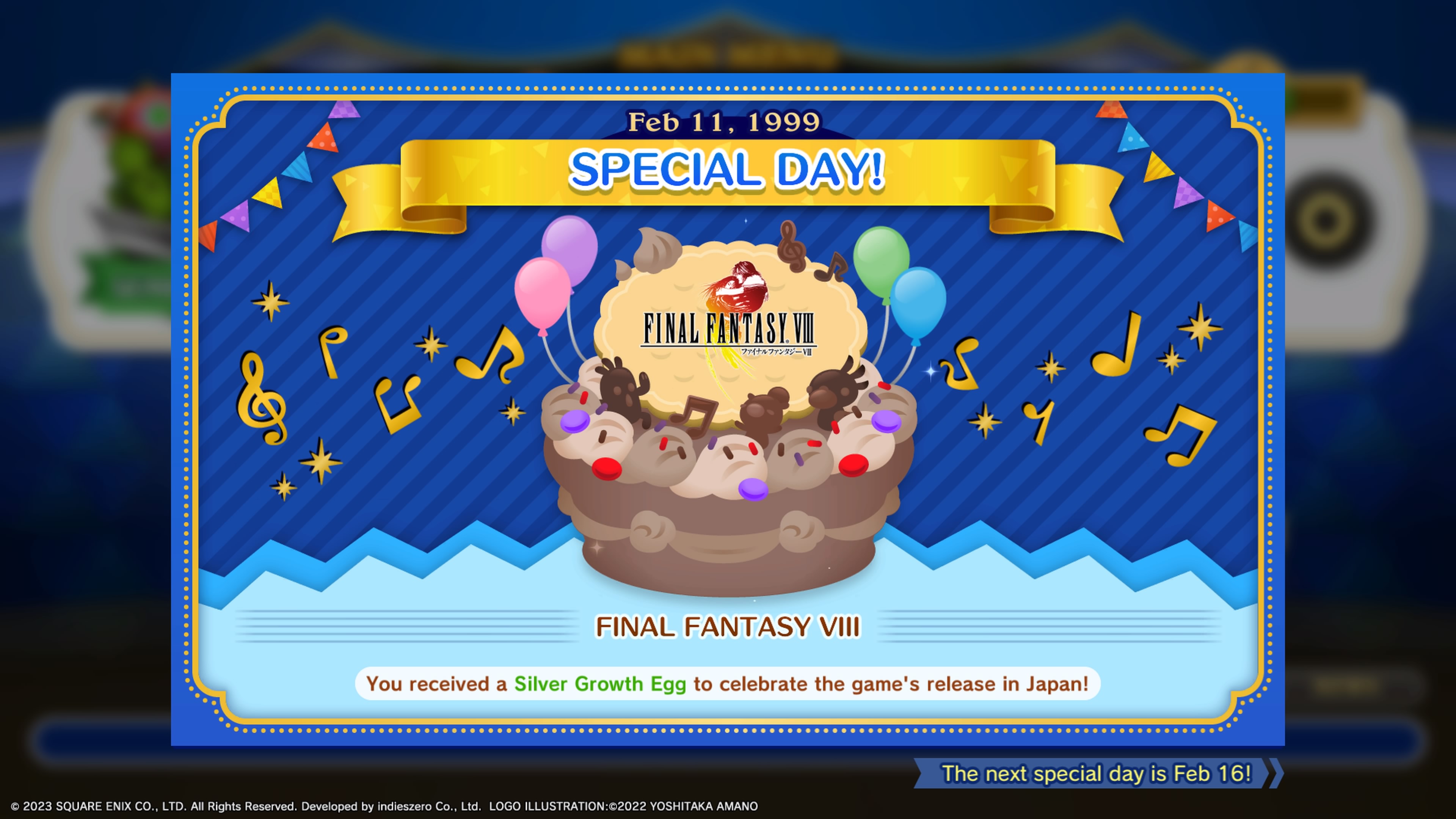 If it is the day a game releases, the game notes that it is a “Special Day,” shows the entry celebrating an anniversary’s logo on a cake, and gives you another Silver Growth Egg. In the case of a “Special Day” notification, it will also let you know when the next “special day” will be. For February 16th, you’ll always get that notification to honor Theatrhythm Final Bar Line’s debut. As a reminder, a Silver Growth Egg in Theatrhythm Final Bar Line multiplies the EXP earned for characters in your party in a Music Stage by two. Theatrhythm Final Bar Line is available for the Nintendo Switch and PlayStation 4.