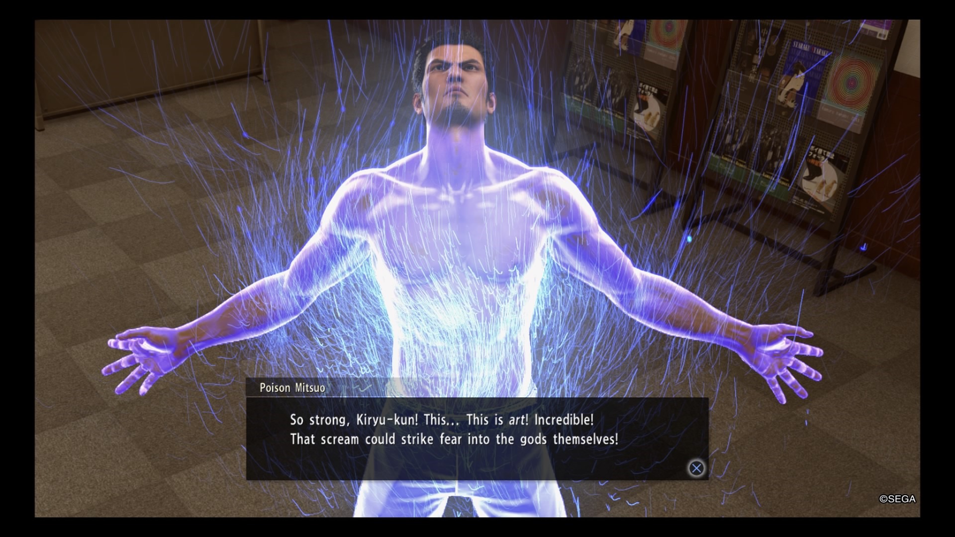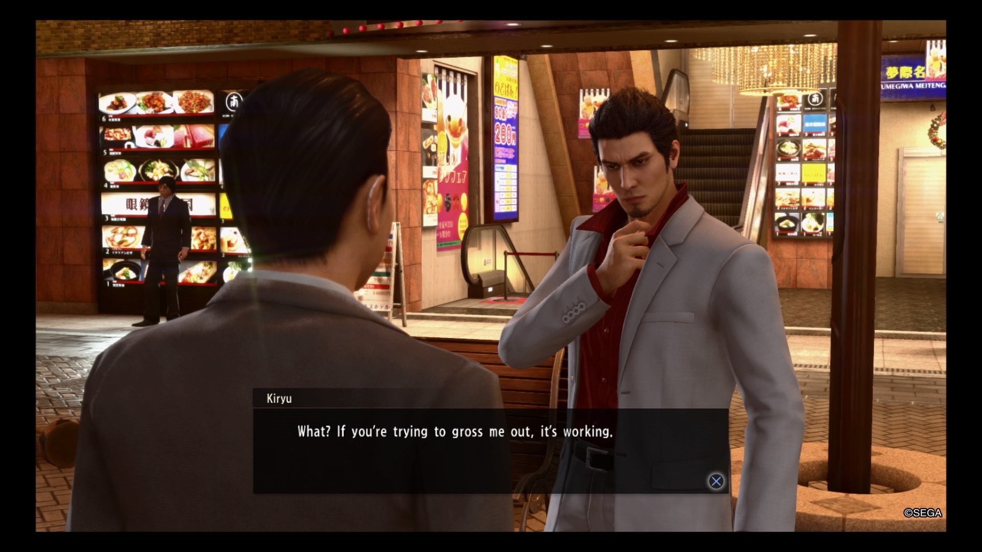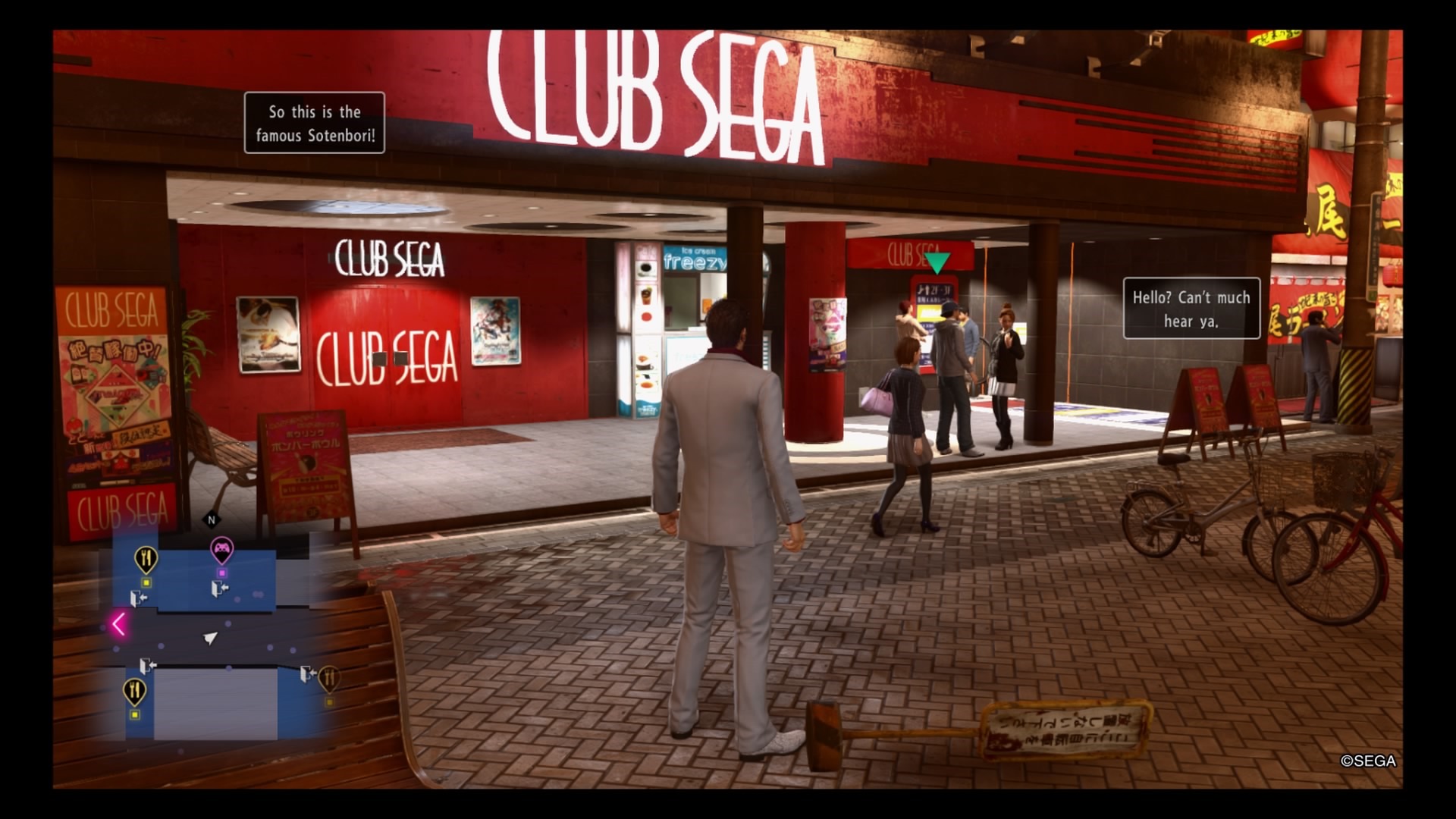 Sotenbori is still a very flashy and lively place, with blunt people who aren’t shy about getting Kiryu’s attention for assistance or force a fight. One of the first story locations you will visit here is actually the Cabaret Grand Club, where Goro Majima was doing his time in Yakuza 0. It is as classy now as it was then, with the same sort of atmosphere and clientele. Lots of the same minigame locations are still open. You can still play Shogi in the south side of the city. The Sunshine Cabaret Club still exists, though in this entry Kiryu will find himself in charge of a rival club later, the Four Shine Club. Gandhara is still open. You’ll even be able to find Club Sega again, though this time instead of classic games, you can find Virtua Fighter 2.1 and Virtual-On, with easy and normal difficulty options. Darts are still available at the STIJL bar too, and you can’t pass up some karaoke on the southwest side of town. I also felt like the Yokobori Golf Center made it feel like there was more to do.