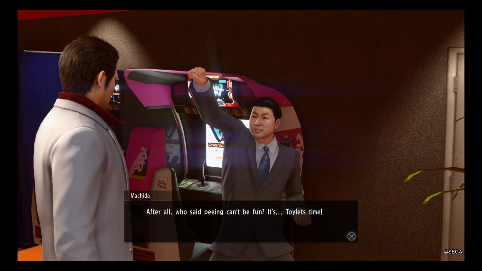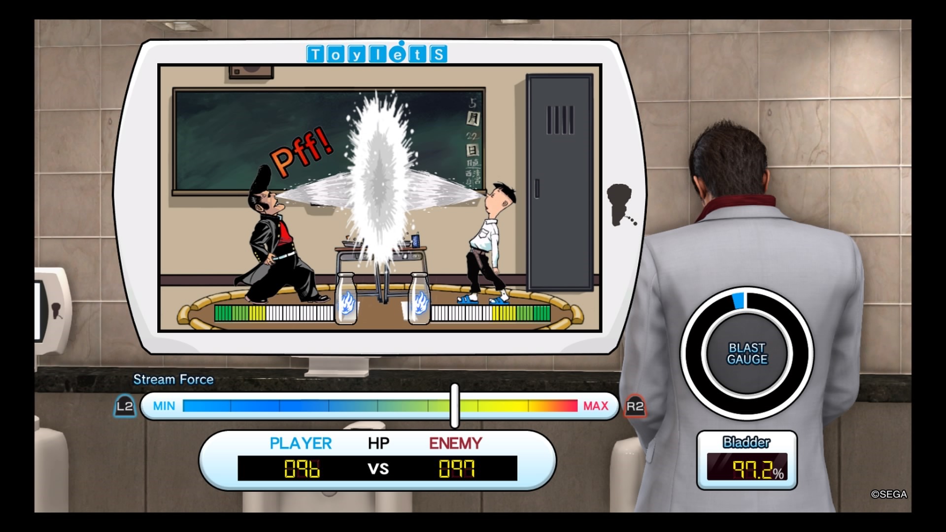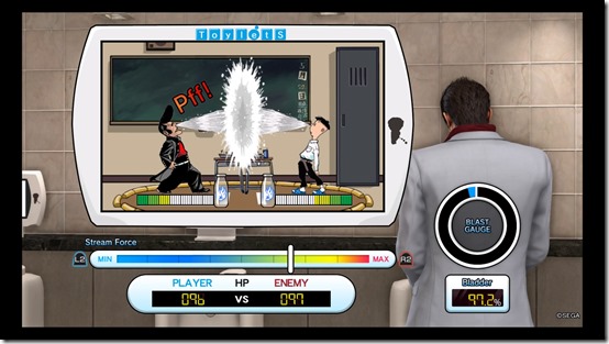 One of Yakuza Kiwami 2’s new minigames unlocks for the first time on a player’s initial trip to Sotenbori: Toylets. This is the urinal minigame where, when Kiryu’s bladder is full, you can play a minigame at a designated bathroom. (Conveniently, after Kiryu agrees to be a lead tester, he gets a Toylets Sensor that alerts the player when the minigame can be played.) I was surprised to see this involves a bit of finesse. Milky Nose has two people drinking milk and having it squirt out of your nose. You have to manage you force via the left and right triggers on the controller, watch your blast gauge for an attack, the percentage left in your bladder, the HP for your enemy and yourself, and the force of your own blast compared to your opponent’s. Though I managed a 510ml on my first try, getting S-ranks on Volume and Speed and an A-rank on Force, I didn’t manage the Force and Bladder Percentage properly, which led to my being overwhelmed at the end of the match.