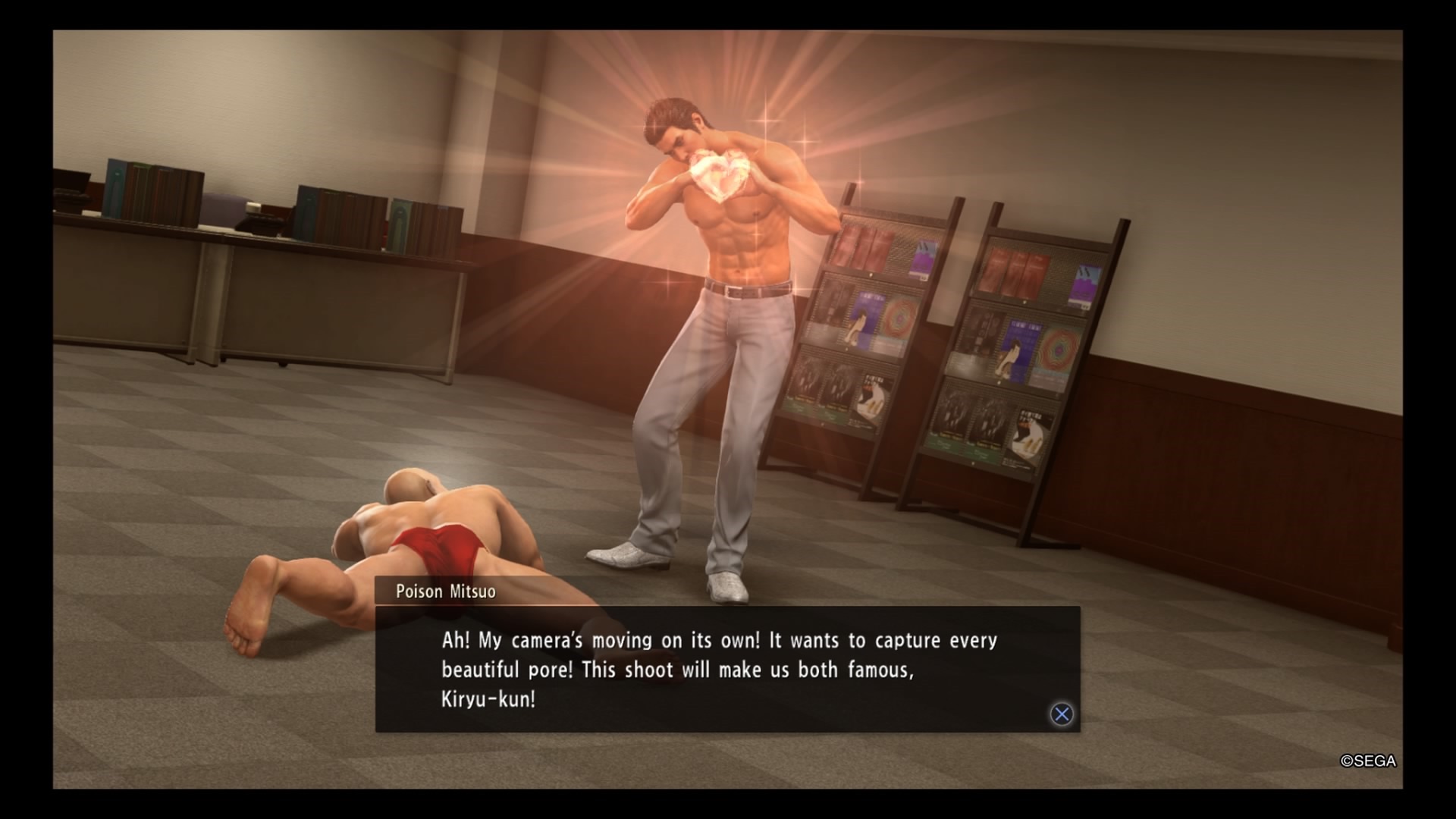 Yakuza Kiwami 2 starts off strong with its initial Sotenbori sub stories. Just like with some of the initial Yakuza 0 sub stories for Majima, there are some immediately memorable ones. Like in Yakuza 0, your first optional sidequests in Sotenbori involved helping a human statue have opportunities to move without his audience catching on, pretending to be a girl’s boyfriend in front of her father, and helping a guy with an early cell phone. While these initial sub stories might not be as involved or lengthy, there are still some pretty great ones to complete as you kick off your adventure. A Mother’s Love has you finding a lost amulet for a mother with a very strong personality. (This is also a good way to grab some Sotenbori Coin Locker keys.) In the Name of Art is an early standout, and perhaps one of the best Yakuza Kiwami 2 sub stories in general, as Kiryu agrees to be a shirtless model for an eccentric artist.