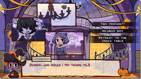 Player decisions will help a young witch, Marzipan, possibly receive her first kiss from a cute monster in visual novel First Kiss At A Spooky Soiree.
