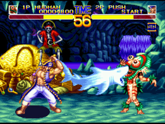 World Heroes 2 is quite possibly my favorite in the series. It doesn’t play as well as World Heroes 2 Jet or World Heroes Perfect but I find that it’s both the most unique and best representation of the series as a whole. If any of you have played the first one, you’d probably just give up on the series. It was clunky even among early 2D fighters (!!!!!) and the gameplay really didn’t stick out. It had two things going for it, though. The first was its personality. The game had a really great sense of humor that MVS games like Aero Fighters 2 were known for at the time. The story was outrageous (it’s about a bunch of fighters from across time assembled to kick each others’ asses on the behalf of a scientist with a time machine) and the historically-based characters quipping with Engrish banter. The other unique factor was its wrestling motif. The controls consist of a punch, kick, and GRAB button, the third being a highly unusual command for a lone button at the time. Furthermore, the game had a Death Match mode where the level you fought in would have hazards (including electrified ropes bordering a wrestling right) that would affect how you needed to play in order to avoid damage and fight effectively.