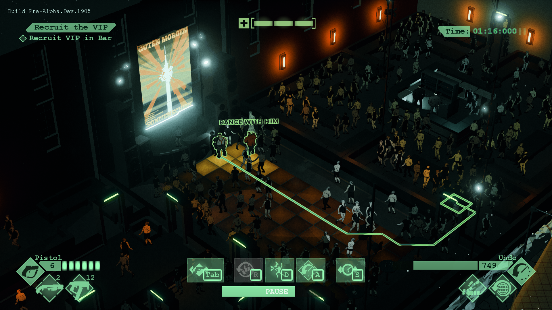 Essentially, it’s solving a packing problem to fill all the space we have available in the club in a Tetris-like automated puzzle. It also abides to club rules of what needs to be placed where and connected to what. Then, on the level of the rooms, we spawn NPCs and objects, adjust the layouts of the rooms and so forth. Out of that, and how the systems interact, the tactical situations the players need to solve arise. We give you a sandbox, a goal, obstacles, complications, and the tools to interact with those in several different ways. What decisions you then make to reach your goal is up to you as a player.