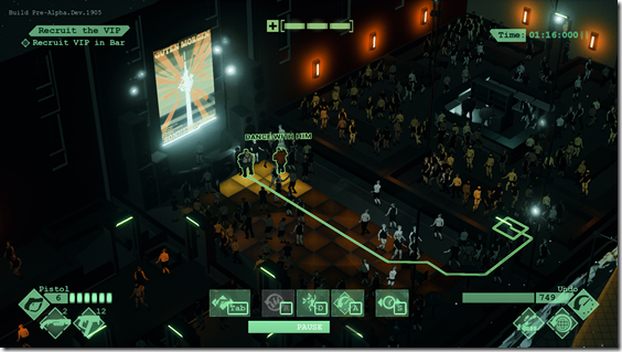 Set in a series of nightclubs, players will face off against foes and other agents, using time travelling abilities to pause and rewind time, constantly re-adjusting their actions to the tune of the beats in each club. Should they succeed, they will see their every move carried out to throbbing tracks.