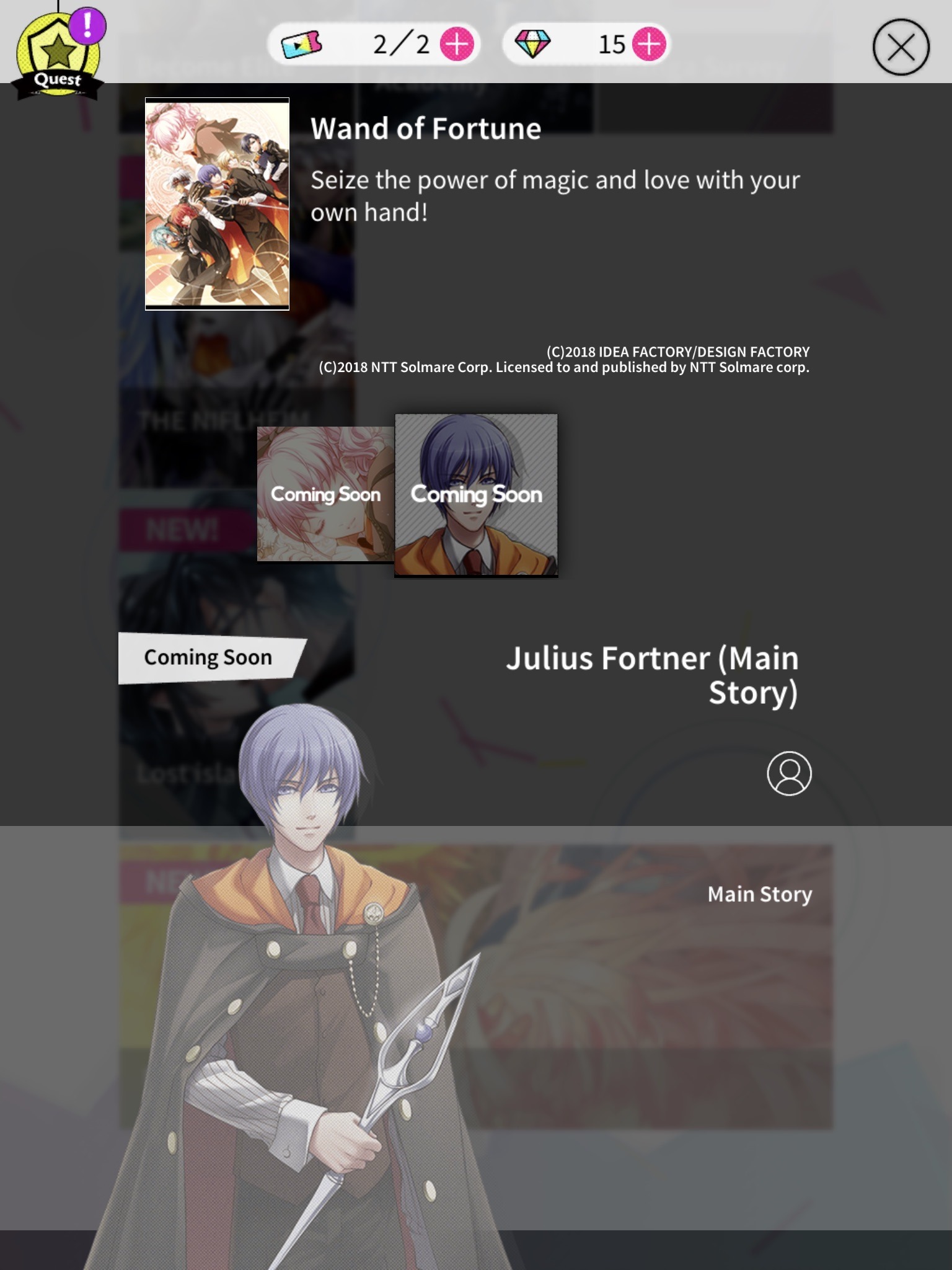 People interested in Idea Factory and Otomate otome visual novels from the past may want to grab Story Jar @ Shall We Date? from Google Play and iTunes soon, as more information has appeared about one of its upcoming localizations. Back in December 2018, Wand of Fortune and Beastmaster and Princes were teased, and now the Wand of Fortune section is open in the app with information about the first route people will be able to play. If people head into Story Jar @ Shall We Date?, they will now see a large panel on the bottom half of the screen showing Alvaro, one of the bachelors in the game. It now notes the game is “coming soon.” If people click the banner, they will see two specific parts of the story will arrive first. One is the prologue, and the other is the route for Julius Fortner. Again, both are labeled as “coming soon” and not given a specific release date.