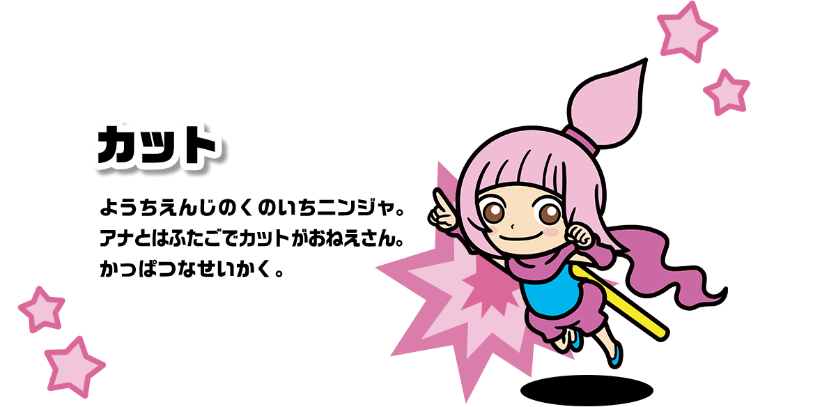 A kindergarten-aged ninja who’s Kat’s twin. She’s more timid compared to her sister. Dribble