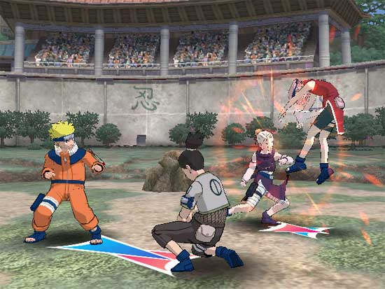 Naruto, Neji, Tenten and Sakura are all in one fight past the break. Before you watch that we have a partial character list to show you. Naruto: Clash of Ninja Revolution is going to have eight environments and 20 characters including: