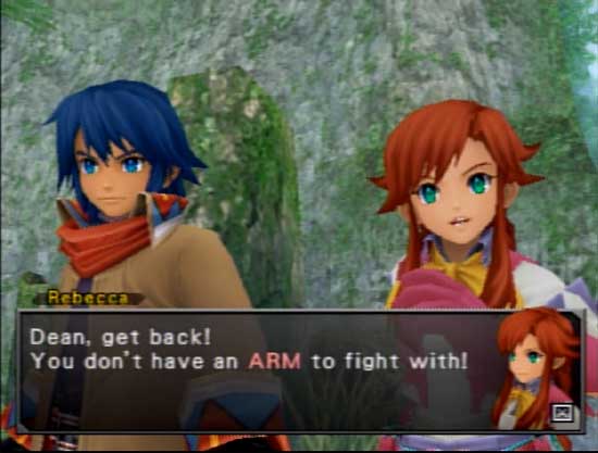 I’m just beginning to dive into Wild ARMs 5 and in the first hour it managed to captivate me. The story begins with Dean, who likes to run around in a poncho and attack with a shovel. He starts out in the runs digging for golem parts. See, when Dean was a little kid he found a piece of a golem and from that day forward he dreamed of excavating one. His spunky partner and childhood friend is Rebecca, an acrobatic gunslinger who has an ARM. The two of them travel to the top of Celestial Peak where Dean is about to say goodbye to her and leave the village to become a Golem Hunter.