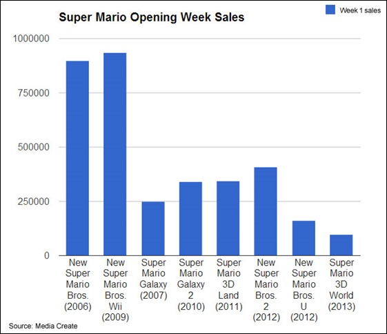 Above is a chart that compares opening week sales in Japan for every Super Mario game released since 2006. As you can see, while no game has ever managed to replicate the success of New Super Mario Bros. and New Super Mario Bros. Wii, most Mario titles have managed respectable opening week sales—with the exception of two games. 2012’s New Super Mario Bros. U sold around 160,000 copies in its first week—a rather shabby performance for a brand new Mario title. However, even that game didn’t do do as badly as last week’s Super Mario 3D World, which sold a mere 100,000 copies in its opening week. You can find a detailed breakdown of first-week Super Mario sales below. New Super Mario Bros. (2006) – 899,518 New Super Mario Bros. Wii (2009) – 934,739 Super Mario Galaxy (2007) – 250,585 Super Mario Galaxy 2 (2010) – 339,901 Super Mario 3D Land (2011) – 343,492 New Super Mario Bros. 2 (2012) – 407,503 New Super Mario Bros. U (2012) – 163,528 Super Mario 3D World (2013) – 99,588 Wii U sales for the week were characteristically poor as well, coming in at 21,002 units sold, which is shockingly low for a week that saw the release of a killer app for the device. Overall, a very poor showing indeed, and one raises the question of just what the Wii U’s future holds, given that even Nintendo’s flagship franchise has been unable to perform its necessarily role—at least in Japan. One could argue that Super Mario 3D World sales will pick up this holiday season, and yes, they probably will. However, Mario’s strength comes partly from how well the games sell throughout the year, and judging by the opening sales for 3D World, this one isn’t going to be breaking any records. Time to find another solution, Nintendo. The top-20 chart for the week was as follows: