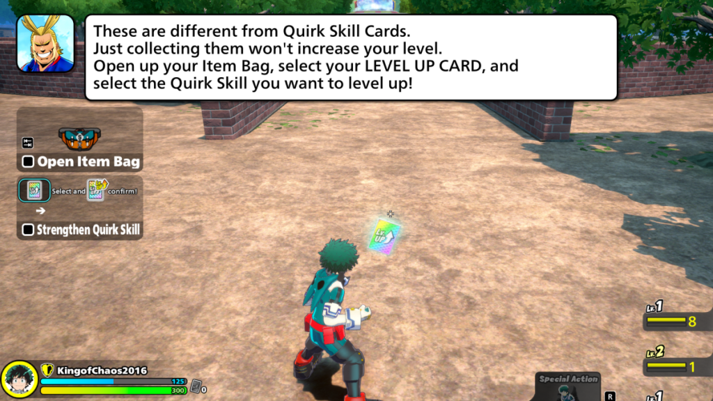 - The most commonly used item that players should look out for is the Level Up Card. One of the gameplay elements unique to My Hero Ultra Rumble is how abilities can be leveled up in battle by acquiring cards to do so. Upon getting one, players can go to their inventory and use these cards to level up their quirks. Doing so will upgrade the quirk’s charge capacity, speed, and attack power. Collecting enough of these cards will turn your quirks into game-changing powers.