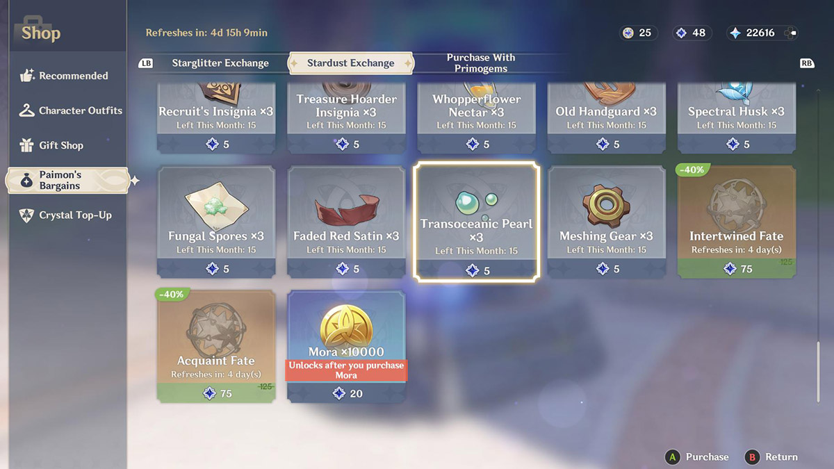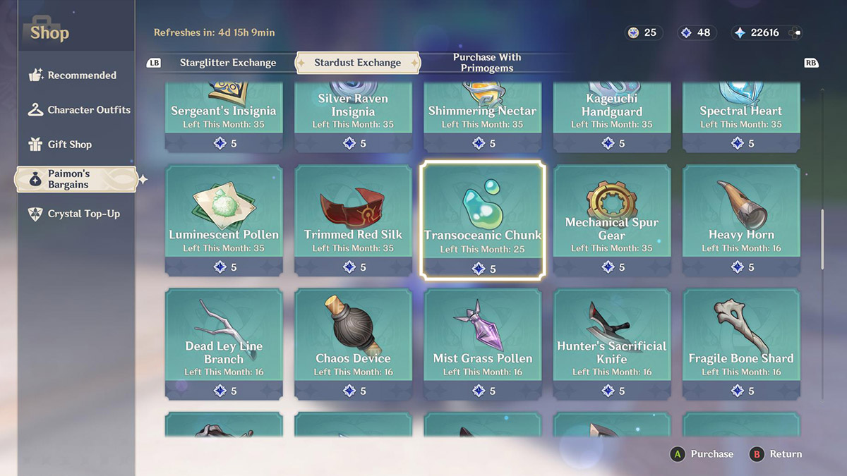 If you don’t feel like swimming underwater, you are in luck! The Transoceanic Pearl and Transoceanic Chunk Ascension Materials can also be purchased at the Paimon Bargain shop. To access it, pause your game and select the shop icon. Next, scroll down to Paimon’s Bargain and select the Stardust Exchange tab. You can get three Transoceanic Pearl for five Stardust. Paimon also offers up one Transoceanic Chunk for five Stardust. However, HoYoVerse limits how much you can purchase per month, so this method is mostly useful if you need just a little more material to finish your build.